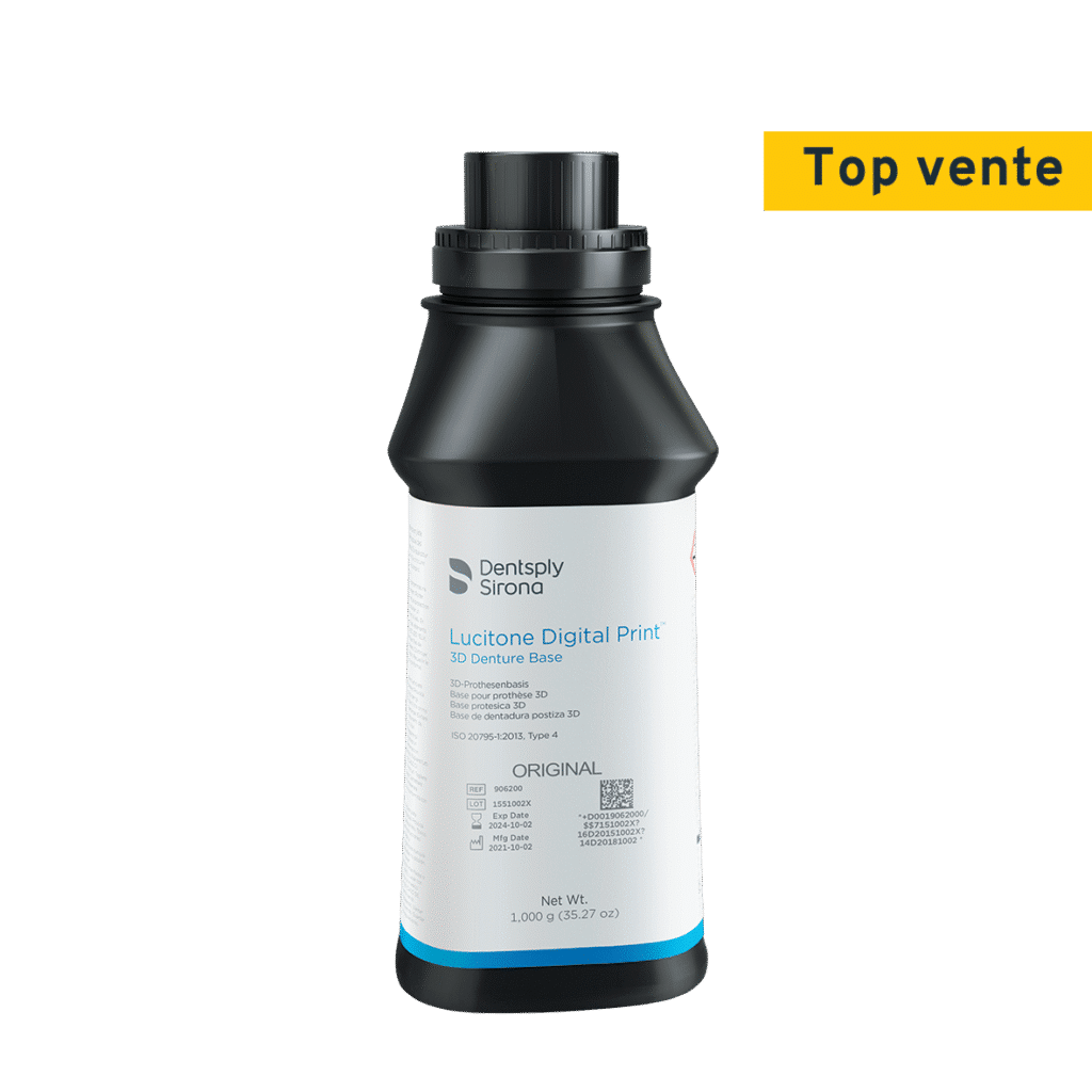 Résine Lucitone photopolymérisable pour la fabrication de bases de prothèses par impression 3D. Indiqué pour les prothèses complètes et partielles ainsi que pour les prothèses sur implants. Fabriqué avec la technologie polymère BAM Smart, un matériau activé par le corps qui double sa résistance à la rupture lorsqu’il atteint la température corporelle. Dispositif médical de classe IIa.