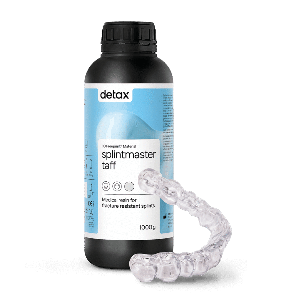 Résine DETAX FREEPRINT Splintmaster Taff est une résine transparente et biocompatible pour la production numérique de gouttières avec une grande résistance aux chocs.